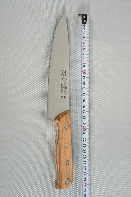 دسته چوبی ارگونومیک با قوس طبیعی، حس ثبات و امنیت بیشتری ایجاد میکند. سه پرچ فولادی نقش مهمی در افزایش استحکام دسته دارند و باعث میشوند چاقو در استفاده طولانی، شل یا لق نشود ⚙️.