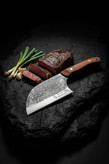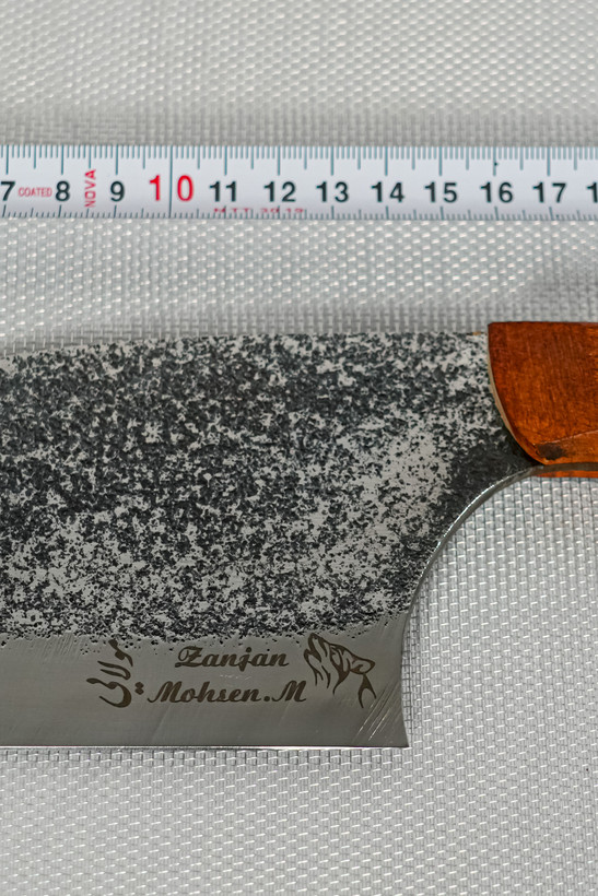 از نظر طراحی، این مدل ترکیبی از فرم ساتور و چاقوی آشپزخانه است؛ تیغه پهن و قدرتمند برای خرد کردن، و نوک مناسب برای برشهای دقیقتر. فولاد آلیاژی زنجان بهخاطر سختی و قابلیت تیز شدن مجدد، سالها در بین حرفهایها محبوب بوده است. تیغهی سنگخورده علاوه بر جلوهی بصری جذاب، در برابر خطوخش و لکه هم مقاومتر عمل میکند. ⚙️