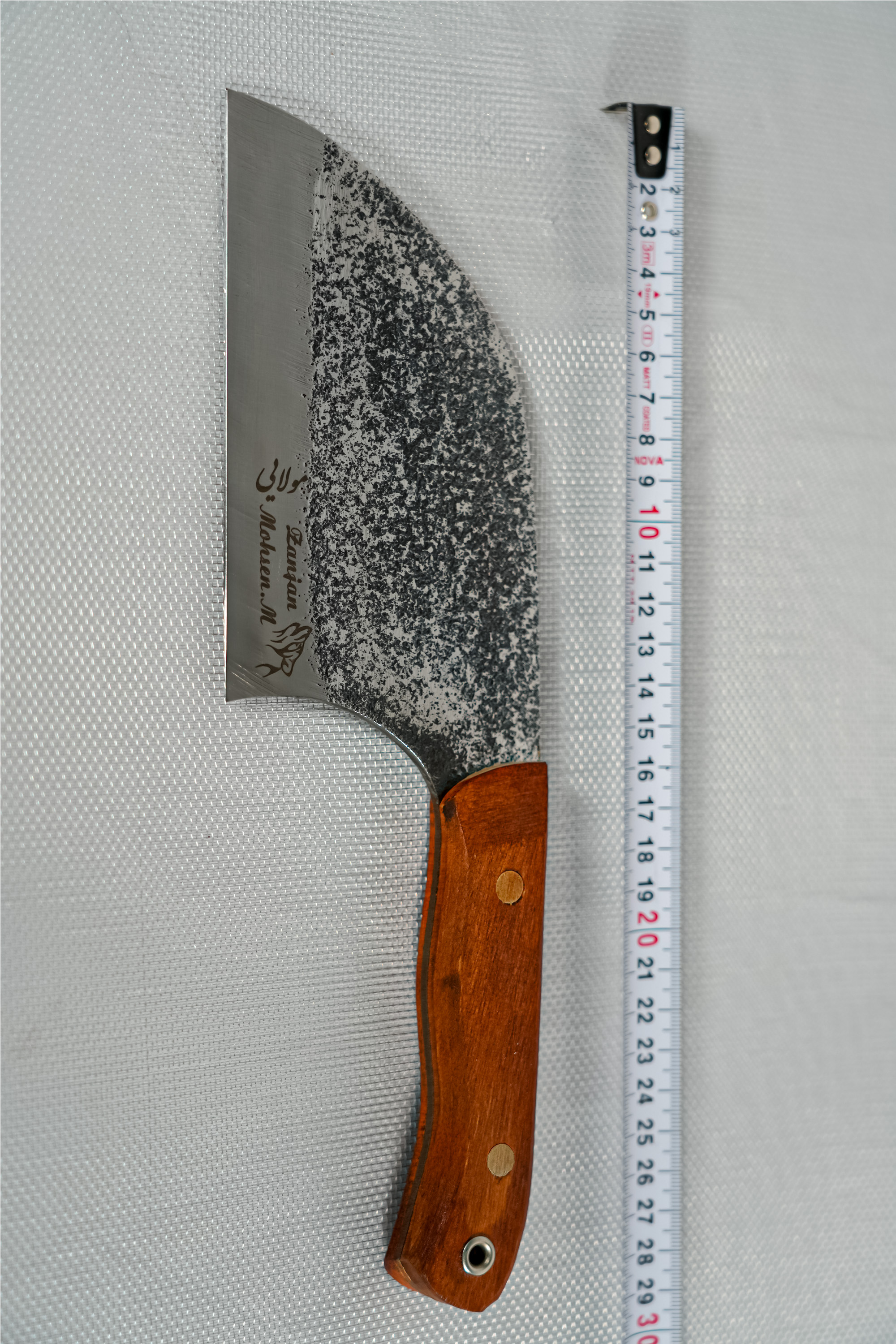 از نظر طراحی، این مدل ترکیبی از فرم ساتور و چاقوی آشپزخانه است؛ تیغه پهن و قدرتمند برای خرد کردن، و نوک مناسب برای برشهای دقیقتر. فولاد آلیاژی زنجان بهخاطر سختی و قابلیت تیز شدن مجدد، سالها در بین حرفهایها محبوب بوده است. تیغهی سنگخورده علاوه بر جلوهی بصری جذاب، در برابر خطوخش و لکه هم مقاومتر عمل میکند. ⚙️
